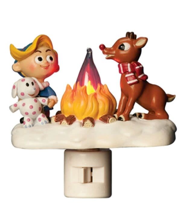 Rudolph et Hermey l'elfe sont assis près d'un feu de camp à ampoule scintillante.