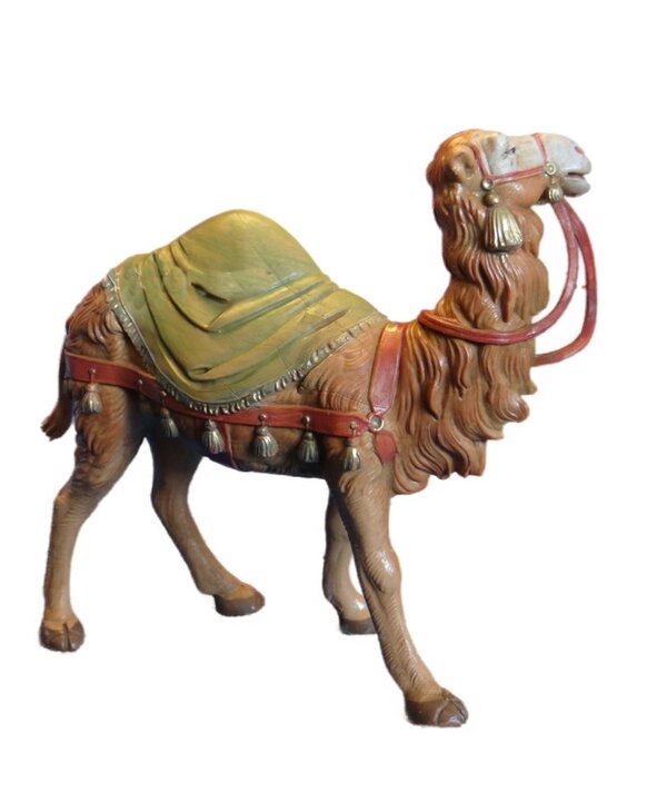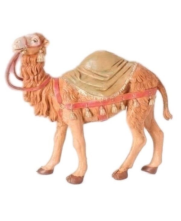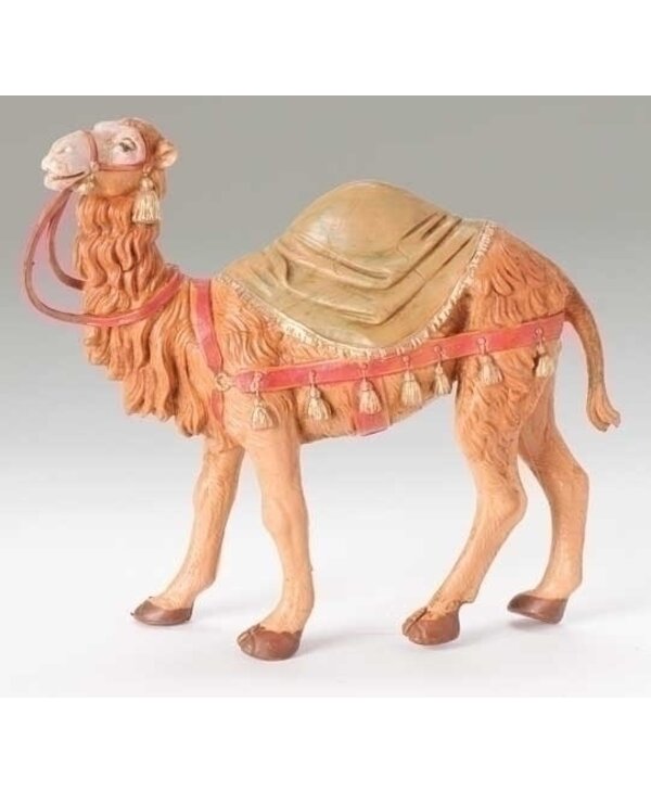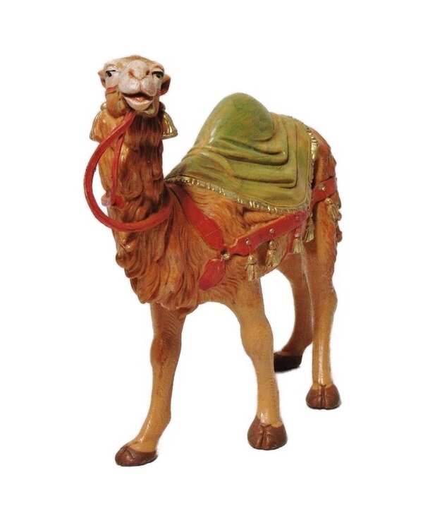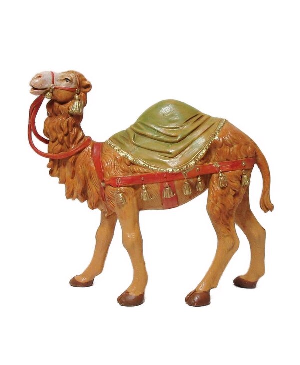 Le chameau avec couverture de selle de Fontanini est une figurine de la Nativité Fontanini Heirloom à l'échelle de 5 pouces, faite de polymère et peinte à la main en Italie avec des peintures non toxiques.