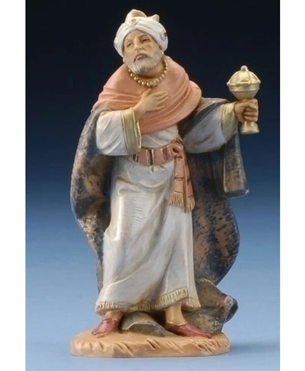 Commencez ou améliorez votre collection Fontanini avec le Roi Gaspar centenaire #72187. Cette figurine en polymère pratiquement incassable à l'échelle de 5 pouces du roi Gaspar apportant son cadeau d'encens à l'enfant Jésus est peinte à la main en Italie avec des peintures non toxiques.