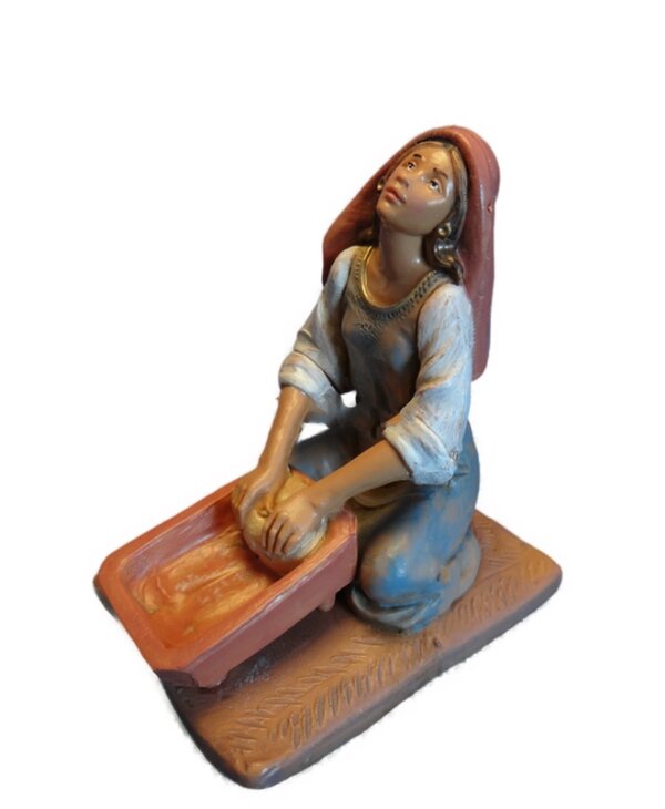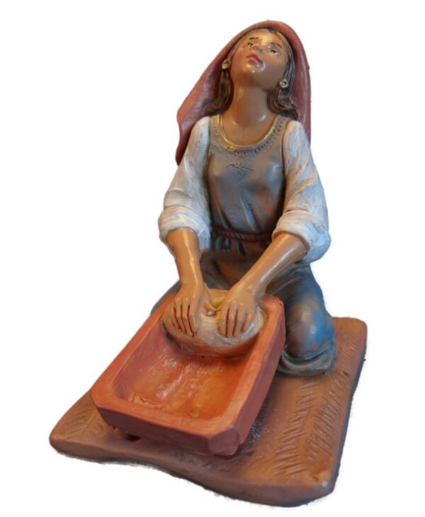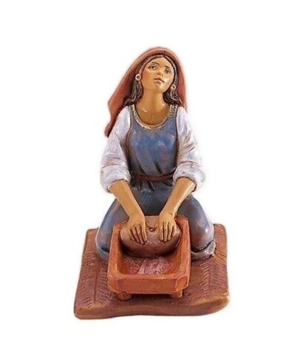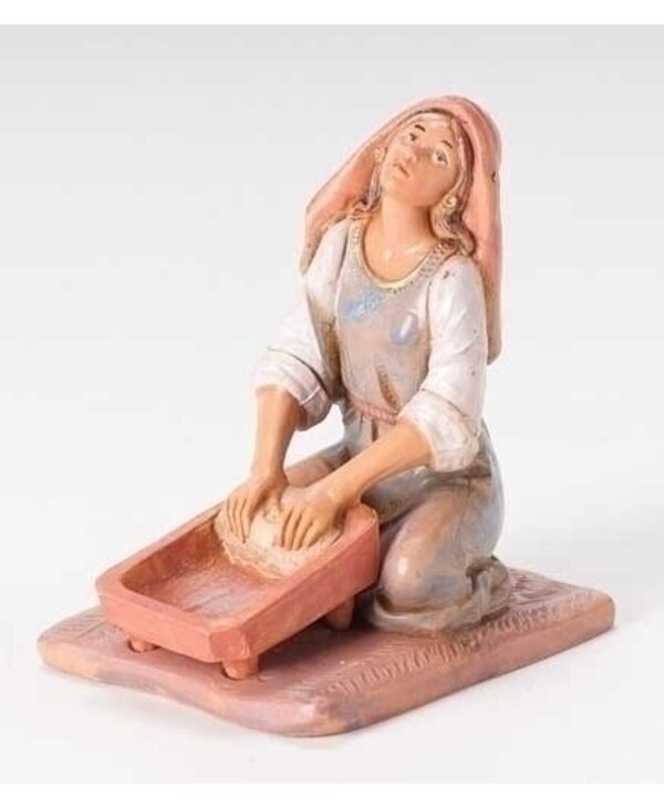 Ruth la boulangère #52548 de Fontanini est une figurine Fontanini Heirloom Nativity Village en boîte-cadeau, à l'échelle de 5 pouces, en polymère et peinte à la main en Italie avec des peintures non toxiques. Ruth est montrée à genoux derrière une planche à pain, préparant la pâte pour la cuisson. Elle regarde vers le ciel, transmettant une expression de remerciement à Dieu.