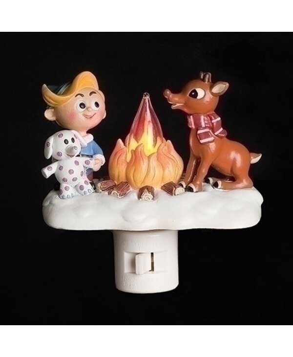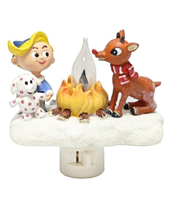 Rudolph and Hermey the elf sit by a flicker lightbulb campfire. Materials: Resin Dimensions: 4.5"H 4.25"W 3.5"D