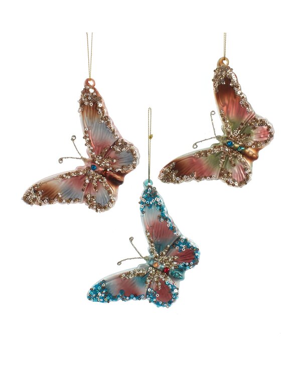 Orn. Papillon Rose/Sarcelle en verre 5" Ass.3