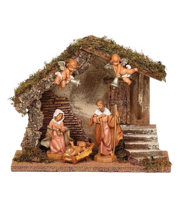 Fontanini Nativity Wedding Creche Scene in 5 inch scale. Includes wooden / moss / bark stable with the Holy Family and two cherubs....Read more